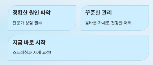- 자세 교정 (모니터 눈높이 맞추기) - 1시간마다 스트레칭 - 온찜질로 혈류 개선 - 가벼운 승모근 스트레칭 - 어깨 내리기 운동 - 충분한 수면