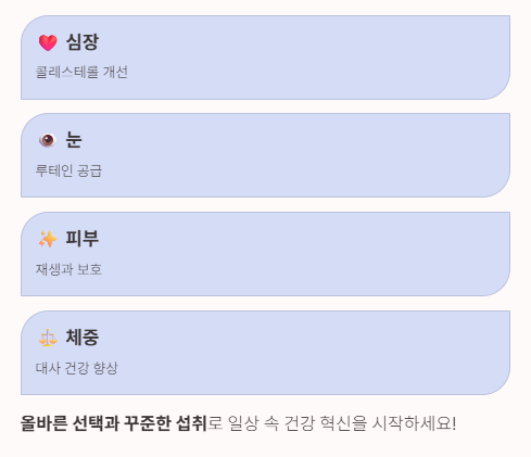 이러한 복합 작용이 심혈관·피부·항염 건강과 연관됩니다.